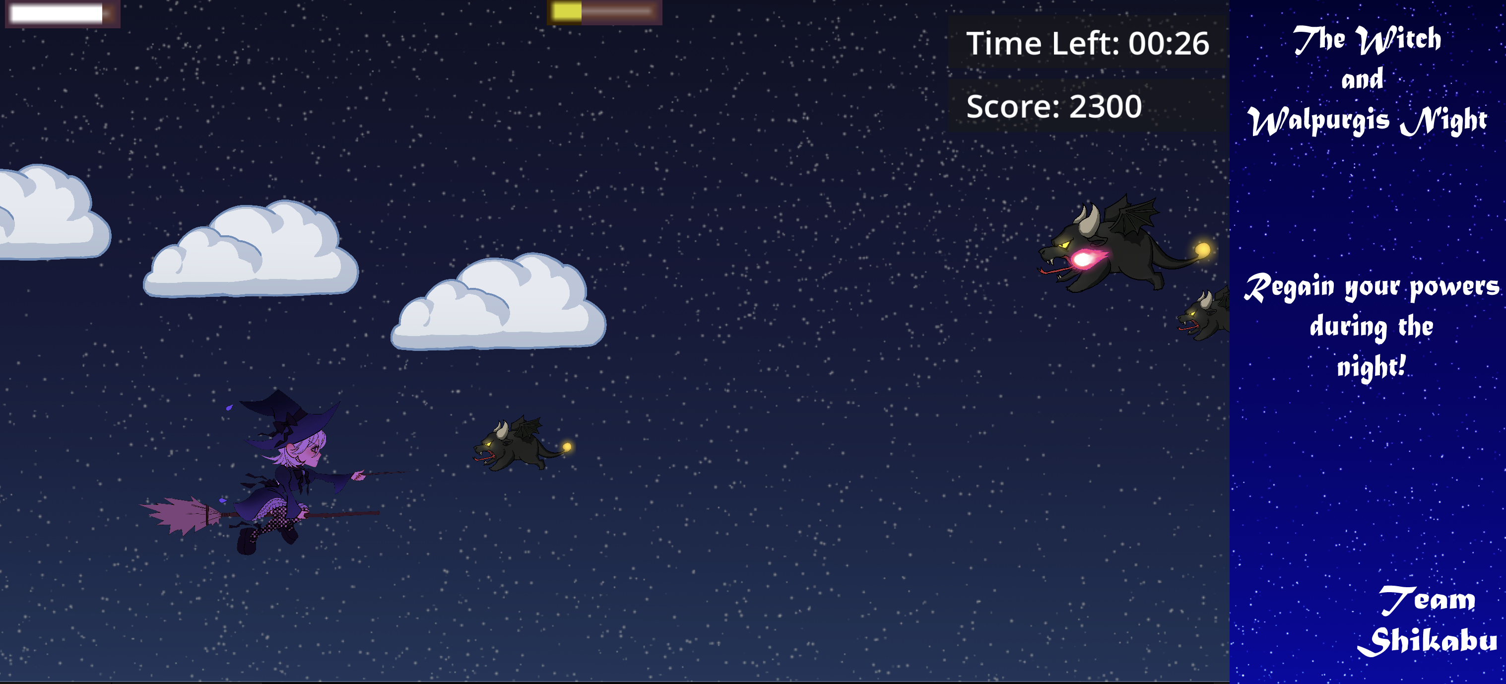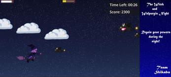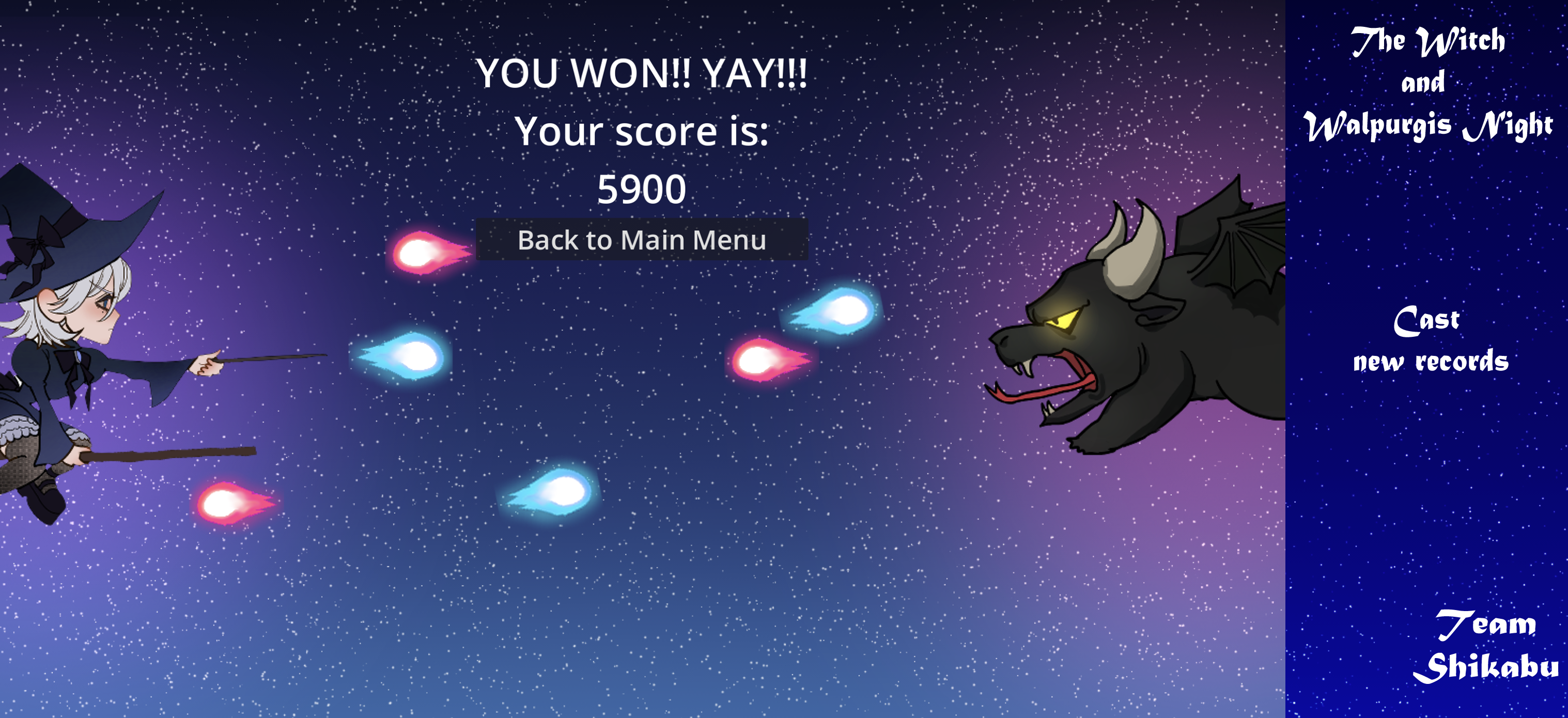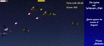 In this game, you play as a witch fighting, yep, DRAGONS, and a big bad yet to be revealed. The controls are simple, spam press the spacebar key or left mouse button to fire off bullets at enemies who will fire back at you. Use WASD keys to move up, left, down, and right. Press the ESC key to open the pause menu where you can adjust audio settings or go back to the main menu. Make sure to dodge their bullets! By defeating enemies you can gain points so you can get that sweet high score when you win the game.
